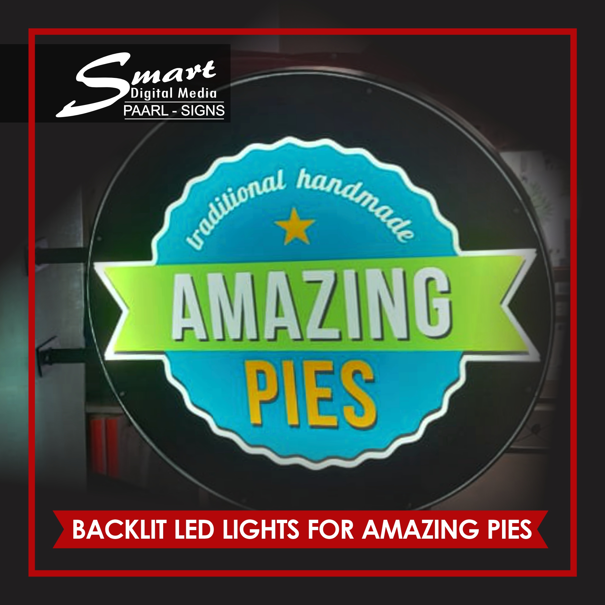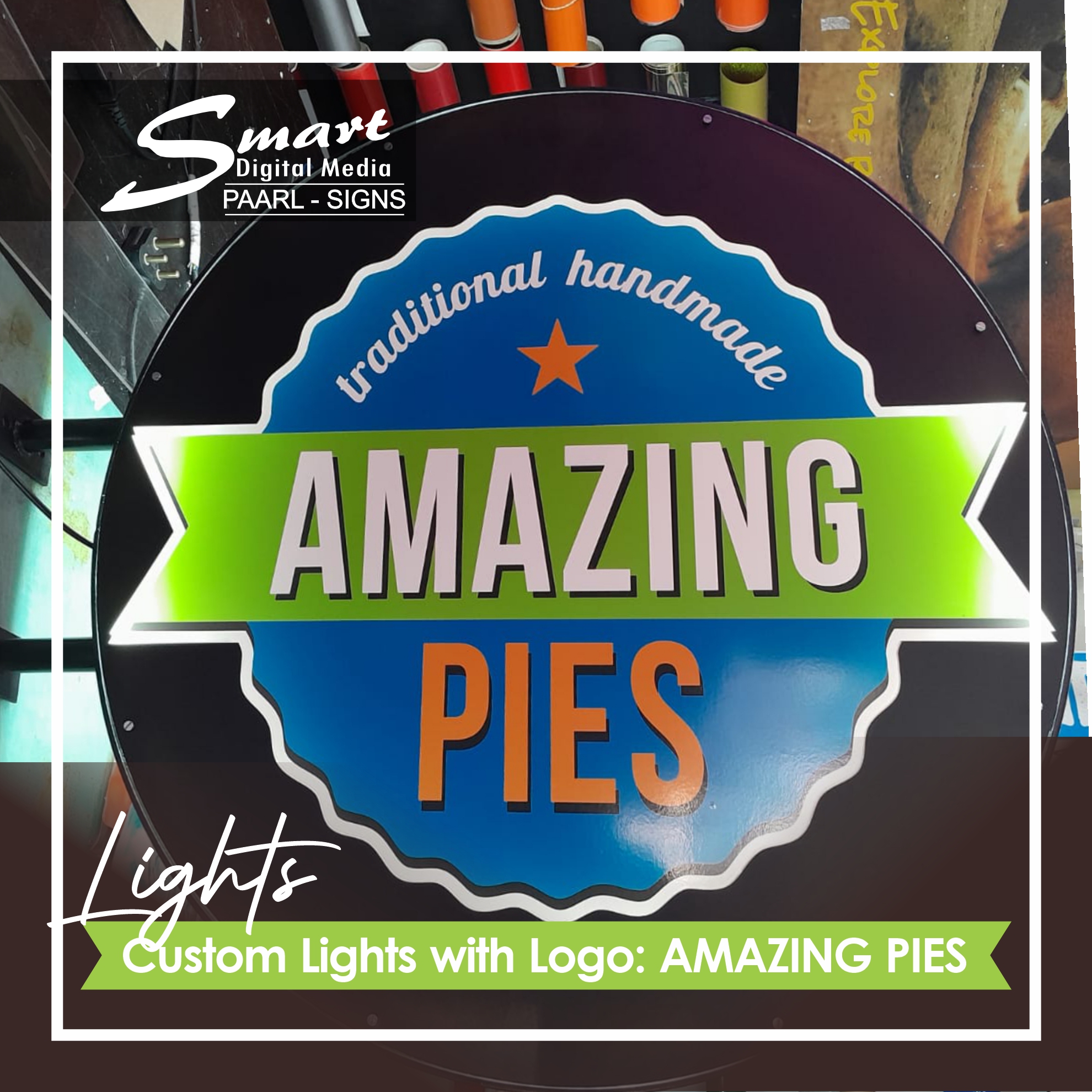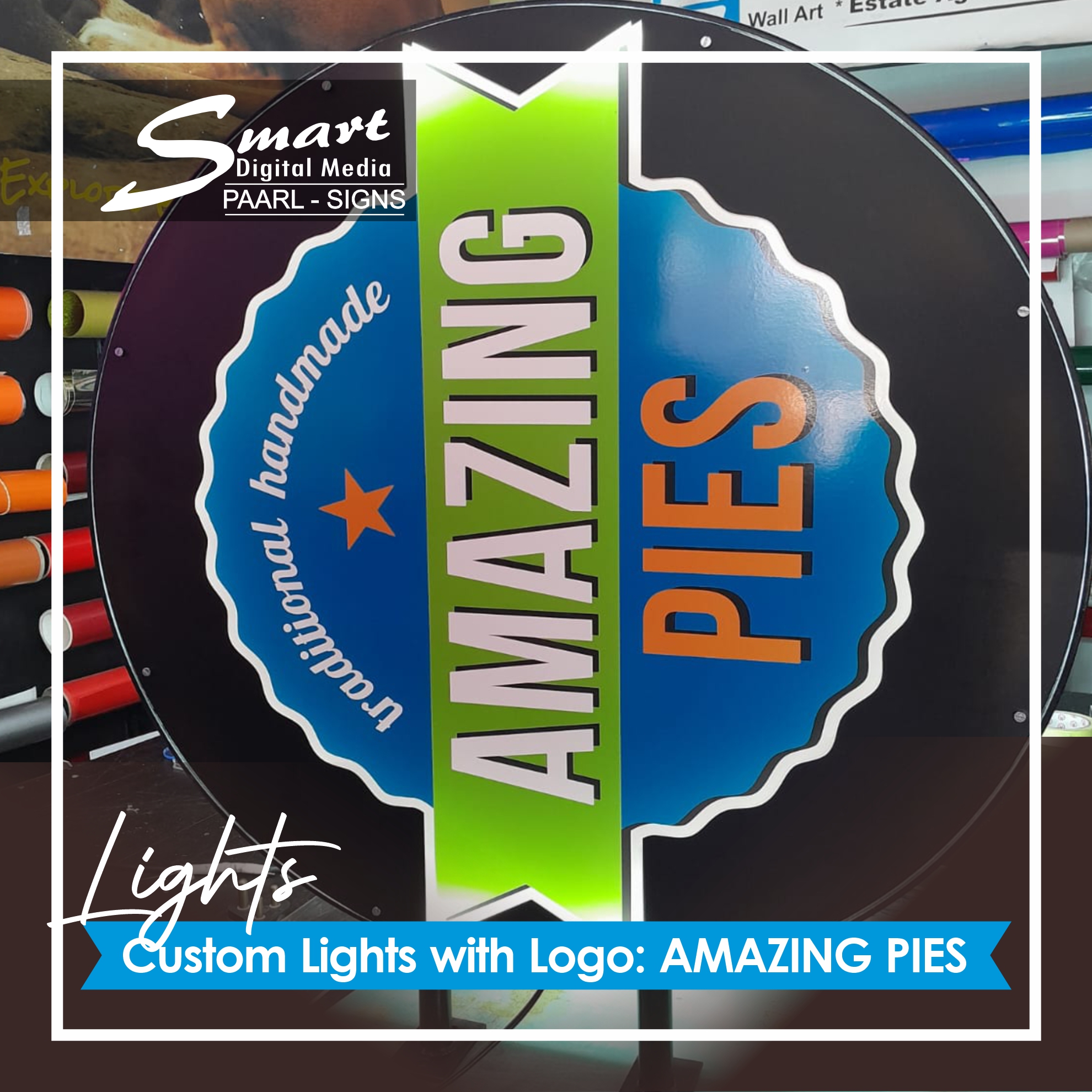 Smart Digital Media Signage in Paarl Make Custom Lights This is a Metal Mounted Steel Frame Sign with LED lighting used for indoor signs. Metal Round rolled steel frame BackLit Lights made for #AmazingPies. NEONS, LED & Light Box Signage completed by Smart Digital Media's Signage Team, 183 Main Road, Paarl, Cape Winelands, Western Cape, South Africa.