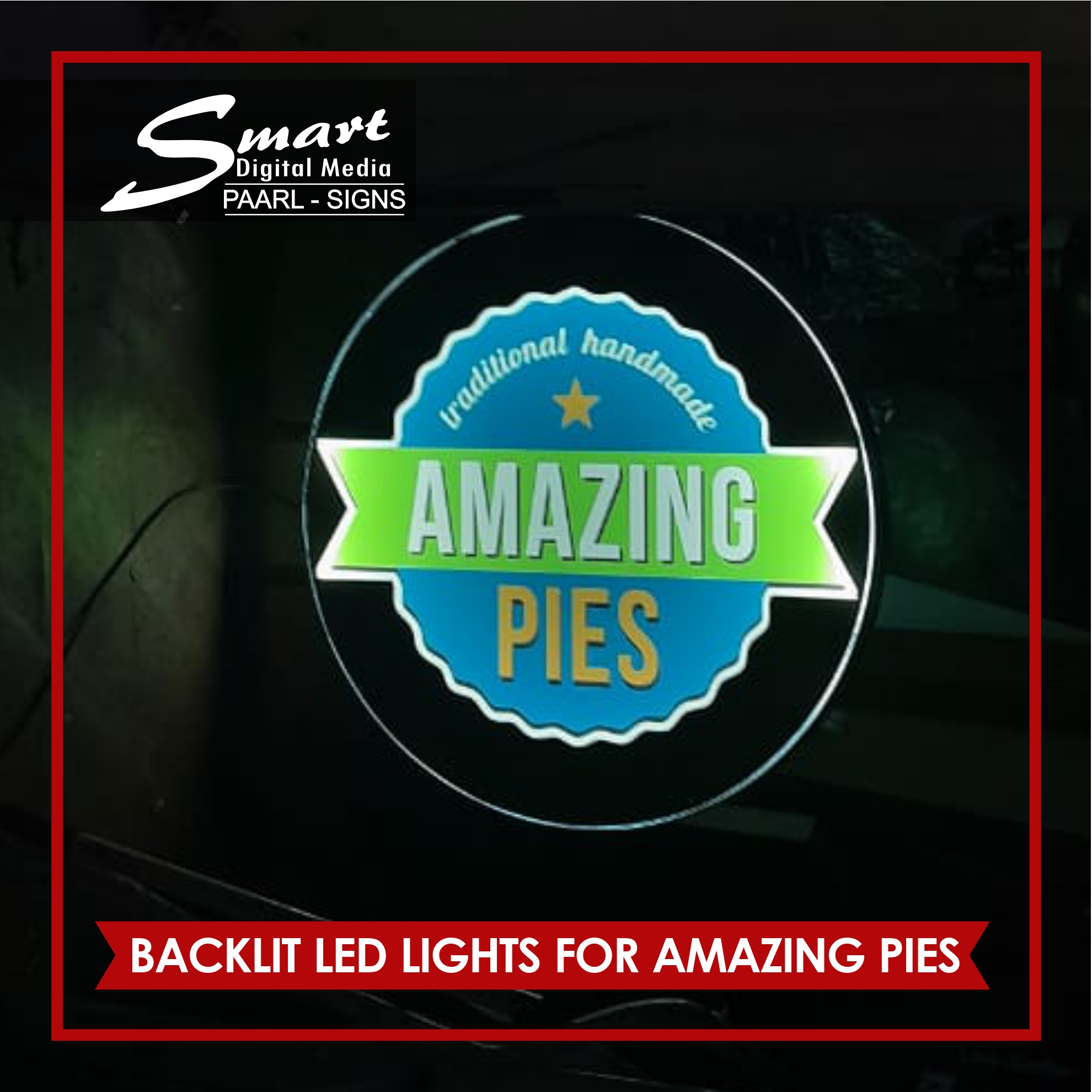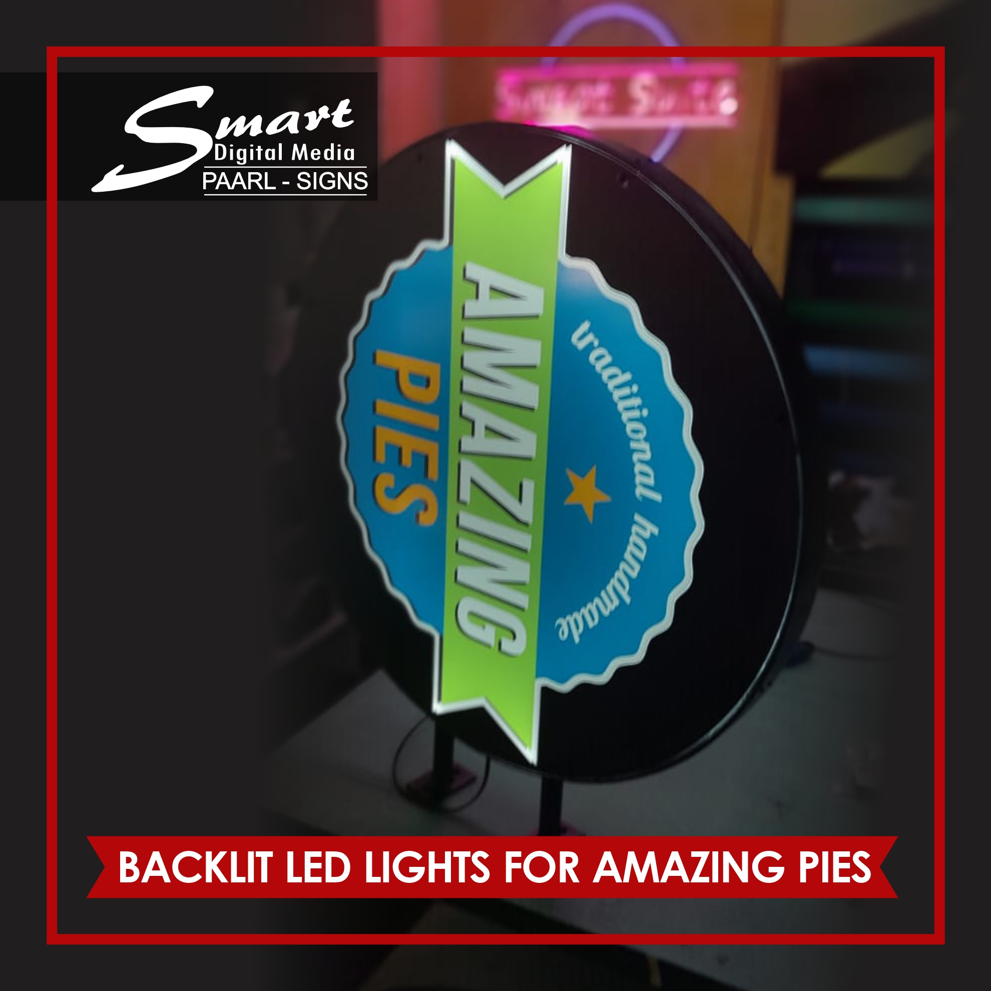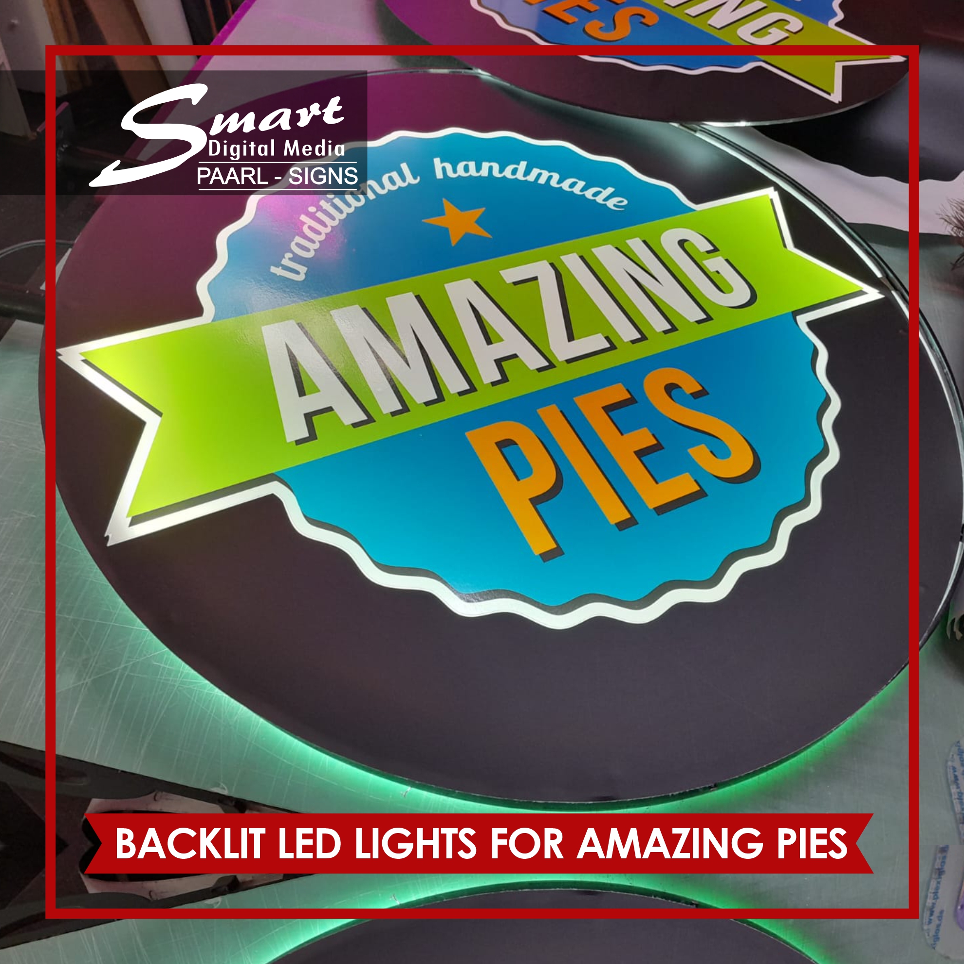Smart Digital Media Signage in Paarl Make Custom Lights This is a Metal Mounted Steel Frame Sign with LED lighting used for indoor signs. Metal Round rolled steel frame BackLit Lights made for #AmazingPies. NEONS, LED & Light Box Signage completed by Smart Digital Media's Signage Team, 183 Main Road, Paarl, Cape Winelands, Western Cape, South Africa.